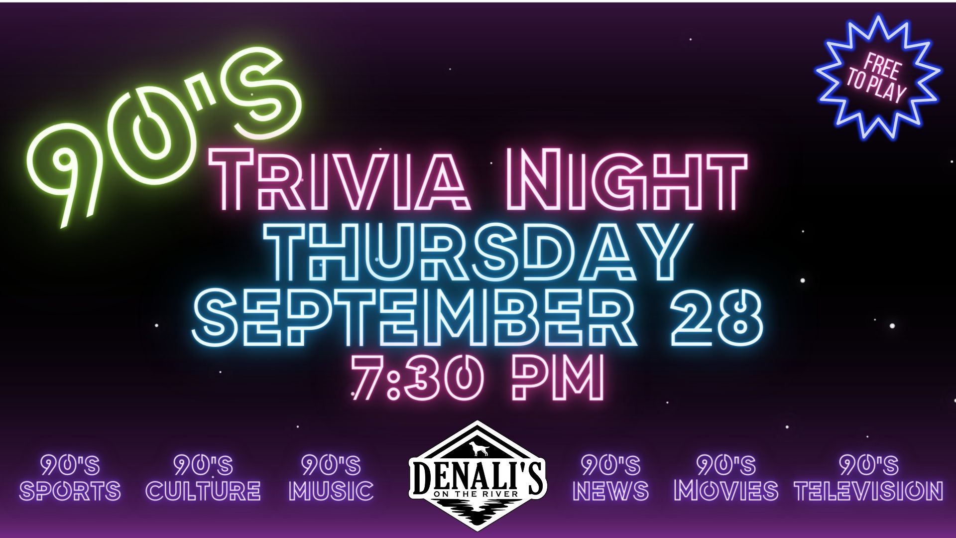 Date Thursday, September 28, 2023 Expired! Time 7:30 pm EntertainmentFeatured Events 90’s Trivia Night Share this event + Add to Google Calendar + iCal / Outlook export Location Denali's Main Building The event is finished. Organizer Denali's Phone 319.334.6576 Email [email protected]