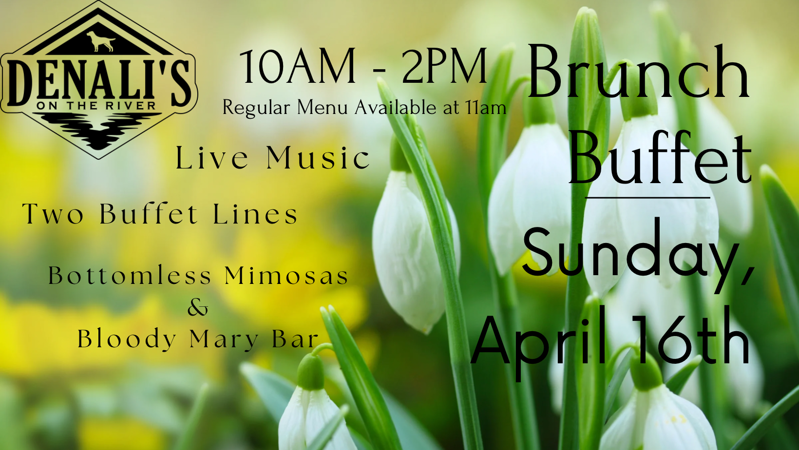 Date Sunday, April 16, 2023 Expired! Time 10:00 am - 2:00 pm Featured EventsFood & Drink SpecialsSpecial Events & Holidays Brunch Buffet Share this event + Add to Google Calendar + iCal / Outlook export Location Denali's Main Building The event is finished. Organizer Denali's Phone 319.334.6576 Email [email protected]