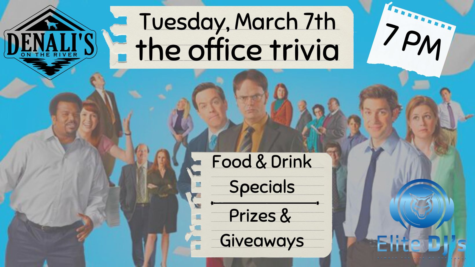Date Tuesday, March 07, 2023 Expired! Time 7:00 pm - 9:00 pm Entertainment “The Office” Trivia Share this event + Add to Google Calendar + iCal / Outlook export Location Denali's Main Building The event is finished. Organizer Denali's Phone 319.334.6576 Email [email protected]
